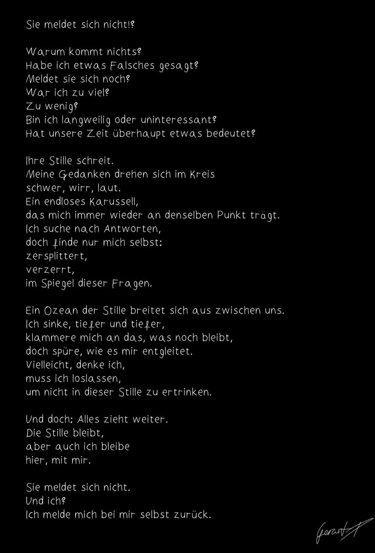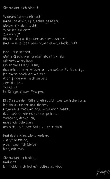 Ein Text, eine Projektion, eine Person im Bild – die Leerstelle zwischen Erwartung und Realität. Diese Video-Installation zeigt das Gefühl des Wartens, das ständige Karussell aus Gedanken. Fragen drehen sich im Kreis, während die Person zwischen Präsenz und Abwesenheit hin- und herschwankt. Das Verschwinden aus dem Bild spiegelt die emotionale Distanz wider. Die Stille bleibt – aber am Ende bleibt auch die Erkenntnis, dass mensch sich selbst in dieser Leere wiederfinden kann.